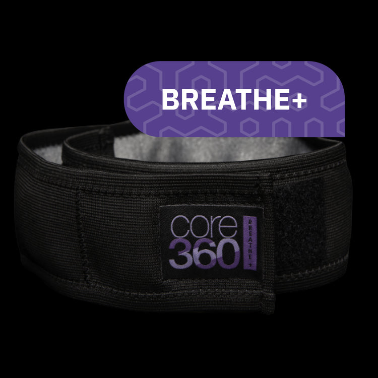 The Core360 Breathe+ Belt features a black elastic body with adjustable hook and loop fastening. Pockets holding the pressure points are black or gray on the side facing your body and black with a purple stripe on the outward-facing portion. The logo and purple stripe offer additional visual cues to enhance core activation and breathing patterns.