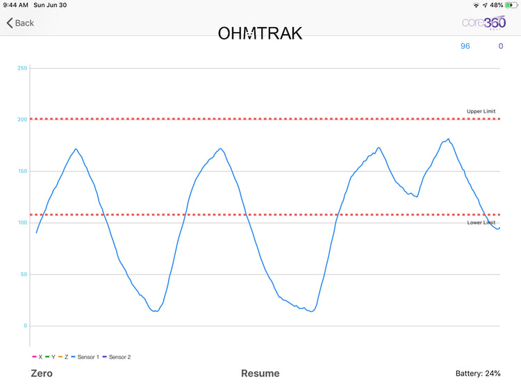 OhmTrak Sensor: Using a sensitive pressure sensor, OhmTrak tracks the expansion that occurs during proper breathing. It offers an accurate representation of the good intra-abdominal pressure necessary for efficient core movement.